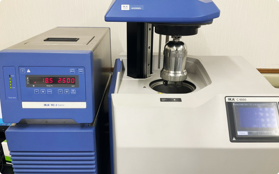 発熱量を測定します。セルの中に入れたサンプルと酸素ガスを容器に封入し、燃焼させることで測定します。